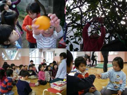5歳児が園庭になったみかんを収穫しています。この後保育室でみかんを食べました。甘くておいしかったです。