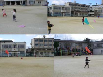 今日はお昼休みに4歳児が、小学校の広い運動場でたこあげをしました。風がとても強くて、たこがよくあがりました。