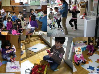4歳児がおにのお面を作りました。紙袋に目の穴を開け、色紙をちぎって貼り付けました。早速作ったお面をかぶってみんなに見せに行きました。