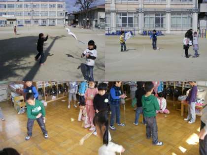 3歳児と5歳児が運動場でたこ揚げをしました。今日もたこがとてもよくあがって園児たちは大喜びでした。