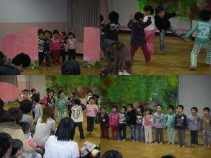 今日は3歳児の生活発表会でした。かわいい桃太郎が生まれました。鬼ヶ島に行ってこおにと相撲をとっています。「今日も元気」の歌を元気よく歌っています。
