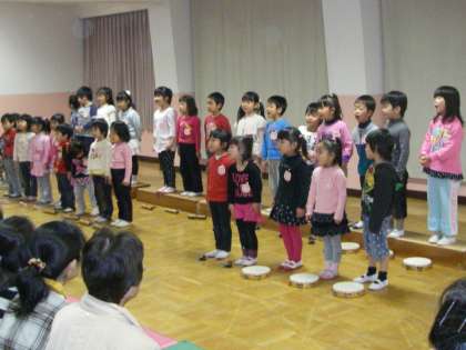 5歳児のうた「青い空に絵をかこう」では保護者の前でも「エイヤー」と元気いっぱいに歌っていました。