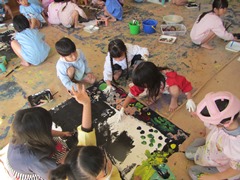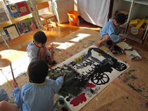 今日は,年長組の子どもたちは,グループ(6〜8人)ごとに,友達と一緒に乗れる大きな蒸気機関車をかきました。「空の色が変わってきた」「ここ石炭にしよう」「ここ乗るところな」など,友達と考えを出し合ったり,共有しあったりしながら,絵の具遊びを楽しみました。