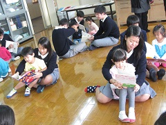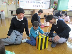 今日は年中さくら組が伏見中学校へ行き、三年生のお兄さんお姉さんと一緒に遊びました。お兄さんお姉さんの温かい笑顔と話し方に安心して一緒に遊び始める姿がありました。一緒に仲良し遊びをしたり、絵本を読んでもらったり、お兄さんお姉さんの手作りのおもちゃで一緒に遊んだりしてどんどん仲良くなりました。最期には、子どもたちが得意な「ナンジャモンジャ!ニンジャ祭り!」のダンスをはりきって披露しました。一緒に踊ってくれるお兄ちさんお姉さんもいて、嬉しくて仕方がない子どもたちでした。