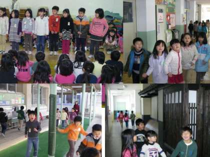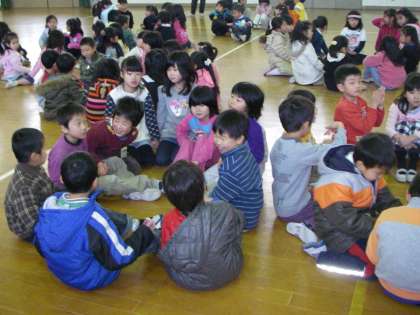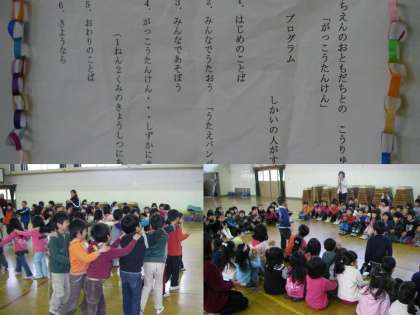 今日は5歳児が伏見板橋小学校を訪問しました。1年生と一緒に「うたえバンバン」を元気な声で歌った後、体育館で「じゃんけん列車」などのゲームをしました。次は学校探検です。図書室や給食室などいろいろな部屋を1年生に案内してもらいました。1年生ととっても仲良しになりました。