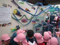 1月9日(水)から14日(月)までこどもみらい館で開催されている、第60回京都市立こども展の見学に4・5歳児がいってきました。伏見板橋幼稚園の園の作品は、全園児でイメージを膨らませてつくった“いたはしすいぞくかん”です。自分たちの作品が飾られているところを見つけて、「ぼくのつくったクラゲがあった!」「私のつくった飾りはここにあるで!」と喜ぶ姿がありました。他にもいろいろな幼稚園の友達のつくったりかいたりした作品をじっくり見て、「こんなんつくりたい!」「見て!これおもしろいで!」と刺激を受けて帰ってきました。