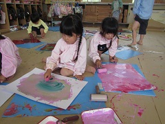 年中さくら組の子どもたちが、今日は自分の画用紙で絵の具遊びをしました。どんどん好きな色を塗り重ねたり、混ぜたりしてじっくり楽しみました。終わった後には床を雑巾掛けしたり、廊下を水で流しながらたわしでこすったりしてきれいにしました。絵の具遊びも片付けも思いきり楽しみました。