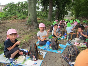年中・年長の子どもたちが,京都教育大学附属環境教育実践センターにじゃがいも掘りに出かけました。手で土を掘ると,土の中からじゃがいもが見えてきました。「あった!」「やったぁ」「大きい!」と自分で掘ったじゃがいもは宝物です。1キロもある重いじゃがいもを大事にリュックに入れて持って帰ってきました。