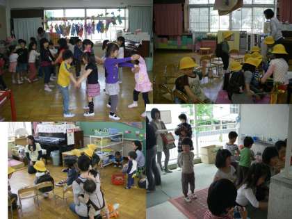 保育参観では、5歳児は「なべなべそこぬけ」のあそびで友達と楽しんでいる様子をお家の人たちにみていただきました。3歳児は、自由に遊んでいる様子とともに自分たちでしっかりと終わりの片付けをしている様子もみていただきました。