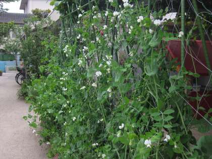 スナップえんどうもかわいいお花とすてきな実をつけています。今年も大豊作ですね。