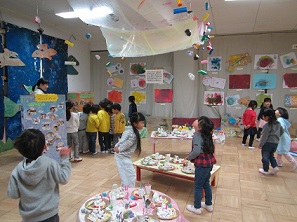 子どもたちの思いのこもった作品がたくさん展示されています。子どもたちも友達や先生と一緒に見学し、「〇〇のあった!」と自分の作品を見つけて嬉しそうな表情でした。幼稚園きょうだいや友達の作品にも興味津々で、「これ、○○ちゃんのや!」「すごいなあ」と見て楽しみました。降園後にはたくさんの子どもたちが、おうちの人と一緒に見る姿があり、ほめられて誇らしい気持ちになったようです。たくさんの方に見に来ていただき、子どもたち一人一人の自由な表現を見て感じて楽しんでいただきたいです。