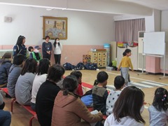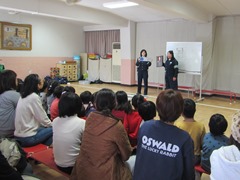 もうすぐ小学生になる年長組の子どもたちが,親子交通安全教室に参加しました。伏見警察署の方が道路や横断歩道の歩き方などを指導してくださいました。まずは交通のお話を聞き,遊戯室に用意した道路を子どもたちだけで歩いてみました。その後,地域交通安全活動推進委員の方や保護者の方に見守られながら実際に道路を歩きました。交通安全について知り,確認すると同時に車の確認をしたり「今は横断歩道をわたって大丈夫」と判断してわたるなど子どもたちが自ら安全を意識し自分で考え取り組む経験をすることができました。見守りご指導いただきました皆様,ありがとうごさいました。