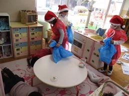 今日は,ゆり組の子どもたちが扮するサンタさんたちがプレゼントをつくって幼稚園のお友達に届けてくれました。