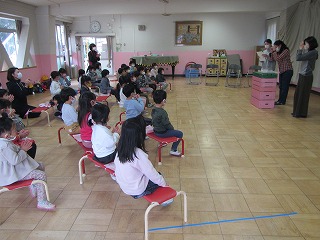 先日(10日)のにっこり広場(預かり保育)では,サンサンキッズ(学校運営協議会)の方々に,3名お越しいただき,読み聞かせをしていただきました。手遊びから始まり,大型絵本『ぴよーん』や,絵本『うんこダスマン』『わらしべ長者』を読んでいただきました。子どもたちはいつもと違う雰囲気にドキドキしながらも,真剣な表情で絵本を楽しむ姿が見られました。サンサンキッズの皆様,いつも子どもたちを温かく見守り,応援してくださり,本当にありがとうございます。これからもよろしくお願いいたします。