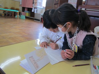 子どもたちは,いただいた絵本をおうちの人や先生と一緒に見て,「おもしろかった!」「こんなのが描いてあったの!」と喜ぶ姿がありました。また,お兄さんお姉さんに「ありがとう」の気持ちを込めて,保護者の方と一緒に思いを文字や絵にして返事を書きました。保護者の皆様,ご協力ありがとうございます。