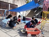 ブルーシートをタープにして,園庭でキャンプごっこを楽しみました。「公園(総合遊具が公園です)に遊びに行ってくる!」「ご飯の用意しておくね」と,家族になって遊ぶことを楽しみました。