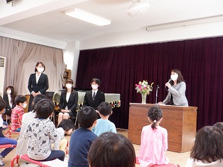 始業式では,園長先生から担任の先生を紹介してもらったり,“い・た・は・し・の・こ”の頭文字をつかった今年度の抱負を教えてもらいました。子どもたちには,友達や先生といっぱい遊んで,心豊かに育ってほしいと思います。