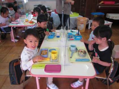 たんぽぽ組は,今日が初めての弁当日でした。登園した時からお弁当の時間を楽しみにしていた子どもたちは,きれいに手洗いや消毒をした後,みんなで「いただきます!」と元気よく食べ始めていました。