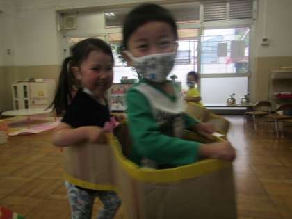今日は朝から雨模様。たんぽぽ組では,段ボールの電車に乗っておでかけです。積み木でつくった駅で待っていると,電車が近づいてきました。しかし,駅をすーっと通り過ぎていき,「通過しまーす」とAちゃん。保育室をぐるっと1周したあと,再び駅を「通過しまーす」と,今度はBちゃんもAちゃんと一緒に笑いながら言っていました。