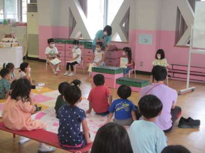 遊戯室で7月生まれの誕生会を行いました。ゆり組の司会を担当した子どもから,