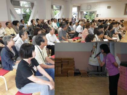 園長先生から、幼稚園の教育方針と園児の遊びのようすについて祖父母の方々に説明をしています。