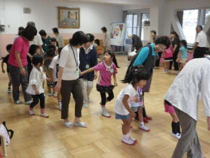 5歳児が祖父母と一緒にチェボガのおどりをしています。