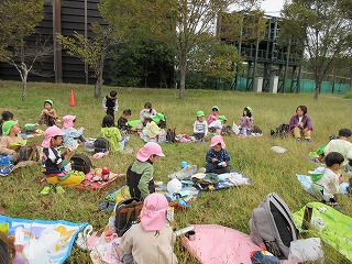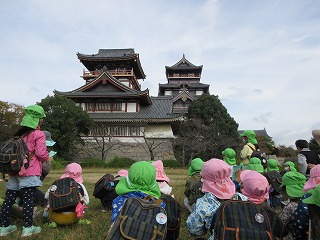 年中・年長組の子どもたちが,伏見桃山城に遊びに行きました。頑張って歩いていく途中で天守閣が見えてくると,皆それぞれ自分の地図を見ながら,「あそこに見える!」「お城や!」と大喜び!到着し,お城を目の前にすると,「すごいなあ」「お城には何が住んでるんやろ」とドキドキワクワク。友達や先生と一緒にいろいろな場所を探検し,「ここは忍者の抜け穴じゃない?」「お城の神様が住んでるかも・・・」などと考えを巡らせる姿もありました。どんぐり拾いも楽しみにしていた子どもたちは,「たくさん見つけておうちの人を驚かせる!」と言って,一生懸命を集める姿もありました。イメージを膨らませながら,秋の自然に親しみ,のびのびと楽しみました。おうちの人がつくってくれたおにぎりもおいしかったね!ありがとうございました!