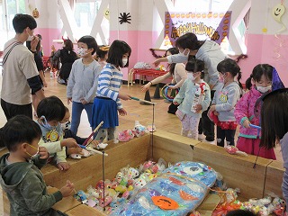 今日は,子どもたちがずっと楽しみにしていたサンサンママ(保護者サークル)によるハロウィンパーティーがありました。遊戯室は,ハロウィンの飾りいっぱいで,ワクワクドキドキの子どもたち。魚釣りや,輪投げ,ボーリング,スマートボール,的当てなど6種のゲームコーナーが準備され,サンサンママさんたちが子どもたちを温かく迎えてくれました。絵本の読み聞かせや,楽しい新聞遊びもあり,お土産のプレゼントもいただきました。教育相談こっこ組に遊びに来ていた子どもたちにもお土産をいただきました。サンサンママの皆様,子どもたちのために企画・準備してくださって本当にありがとうございました。