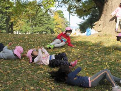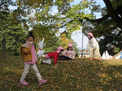 京都御苑の木々が色づき始め,とても美しく,きれいな落ち葉を見つけ,おうちの人に見せたいと言って持ち帰る姿も見られました。どんぐりや松ぼっくりをたくさん集めたり,友達や先生と一緒に鬼ごっこを楽しんだりして,秋の自然を満喫しました。みんなで食べるお弁当もおいしかったです。おうちの方,おいしいお弁当をありがとうございました。