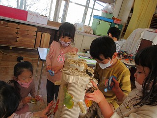 「もっと素敵な木にしよう!」と園庭で拾った落ち葉や小枝,園外保育で見つけた秋の自然物などを,みんなでつくった大きな木に飾りつけました。出来上がった木を見て,「さくら組の木ができた!」「こんな素敵な木,見たことないなあ!」「リスさんが遊びに来るかも」などと大満足でした。