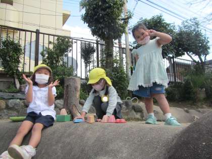 昨日の遊びの続きをしよう,と思っていた子どもたちが,今日も園庭で遊びました。今日はトンネルの上に,砂場でつくったごちそうを動物たちのご飯として運んだり,総合遊具の上で友達と一緒にごちそうを食べたりしていました。