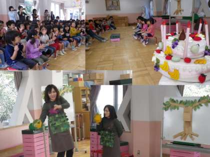 今日は10月生まれのお誕生会です。8人のお友達がお誕生日を迎えました。先生の楽しいエプロンシアターでは、すてきなおいもさんが登場しました。