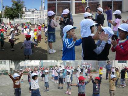 5歳児が9日に開かれる幼稚園大会に向けて乾隆幼稚園、待賢幼稚園、深草幼稚園、伏見南浜幼稚園の5歳児と一緒に交流しました。