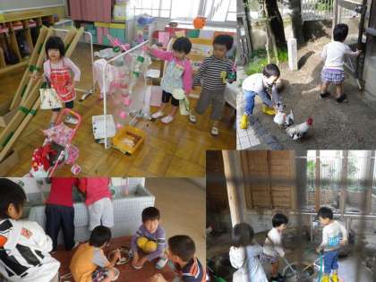 3歳児がチャボの小屋を掃除したり一緒に遊んでいたりしています。