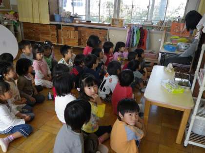 4歳児は、「さつまのおいも」の絵本を先生に読んでもらっています。明日のおいも堀が楽しみですね。