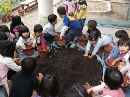 3歳児が一人一鉢でサクラソウの苗とチューリップの球根を植えました。