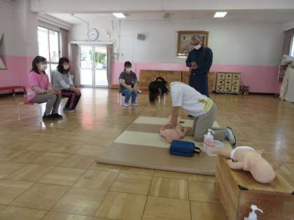 胸骨圧迫の方法や,AEDの正しい使い方などを指導してもらいました。