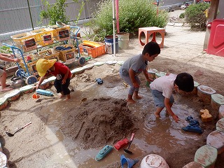園庭では,色水遊びと砂遊びがどんどん一緒になって…,大きな川ができました。裸足になって,水の気持ちよさを感じて遊んだり,砂場道具の乗り物を動かすことを楽しんだり,気持ちを開放して遊んでいました。(3枚目写真)