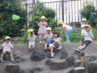 4月に入園した子どもたちも、1学期間を一緒に過ごし、“たんぽぽ組の友達”を感じて遊ぶことが増えてきました。登園して身支度を終えると、今日も「お外に行ってくる!」と、さっそく朝から園庭に出かけていきました。担任も園庭に出てみると…みんなで大好きな築山の上に登り、虫取りをしたり、ダンゴムシを探したり、築山に上ることを楽しんだり…楽しんでいることはそれぞれですが、友達と一緒にいることが嬉しいのだと思います。