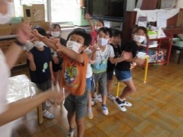 絵描き歌やダンスも交えながら、横断歩道を渡るときに車に手で合図を出して渡る「合図横断」について学びました。
