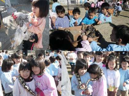 今日は一日動物園でした。かわいい小さなうさぎをなでている子や、ふさふさの毛があるひつじの背中をなでている子、イグアナにびっくりしている子、おそるおそるにわとりをだっこしている子など今日はとても楽しい1日でした。大きな蛇を首に巻きつけてもらいました。