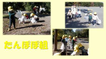 4歳児たんぽぽ組は、たくさんの落ち葉で遊んだり、どんぐりを拾ったりしました。前回、どんぐり拾いで見つけたどんぐりとは違う形のものを見つけて、とても嬉しそうでした。