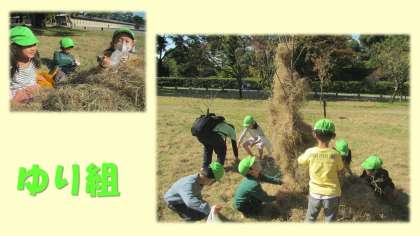 5歳児ゆり組は、たくさんの藁を集めて山のようにしたり、鳥の巣をつくろう!とイメージをふくらませたりして遊びました。