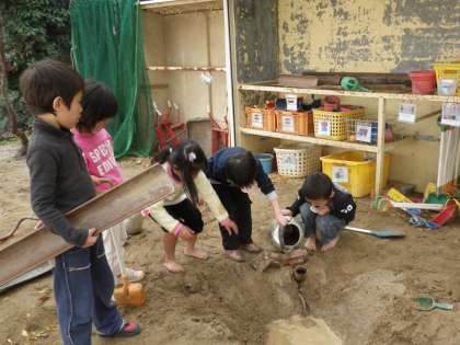 4歳児が寒風の中砂場で水遊びをしてあそんでいます。夢中になっていると寒さも忘れますね。