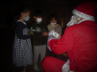 なんとサンタさんがやってきてくれました!目の前に突然現れたサンタさんに、「本物なの?」「どうやって1日でプレゼントを届けるの?」と質問したり、「サンタさん大好き!」「〇〇がほしいです…!」と直接お願いを聞いてもらったり。最後には一人一人へプレゼントも渡してもらい、大喜びの子どもたちでした。