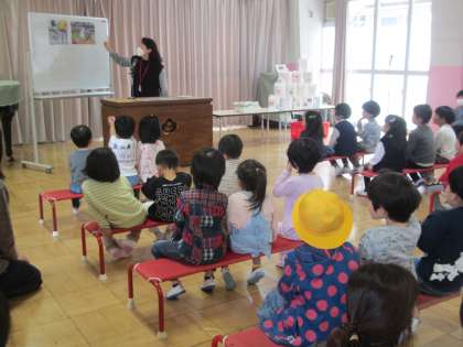自分たちが1年間遊んできた保育室やロッカー、ままごと道具などの掃除をした後、遊戯室で園長先生の話を聞きました。