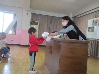 園長先生から進級記念品をいただく時には、修了式のゆり組さんのように返事をして前に出てきていました。