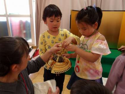 写真をみながら、「これはここにおくんちがう?」「かっこいいなぁ」と楽しんで飾りました。幼稚園の子どもたちが元気にすくすく育っていくように、五月人形がしばらく子どもたちを見守ってくれています。