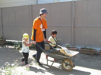 砂の山を登ったり、トンネルをつくったりして、たくさん遊んできました。今日はその砂を“工事ごっこ”と称して、園庭とたんぽぽ組の砂場に運んでいきました。