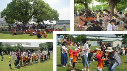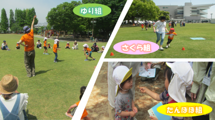 お天気にも恵まれ、全園児でなべなべそこぬけや、ロンドン橋を親子で楽しんだ後、クラスごとにわかれて遊びました。